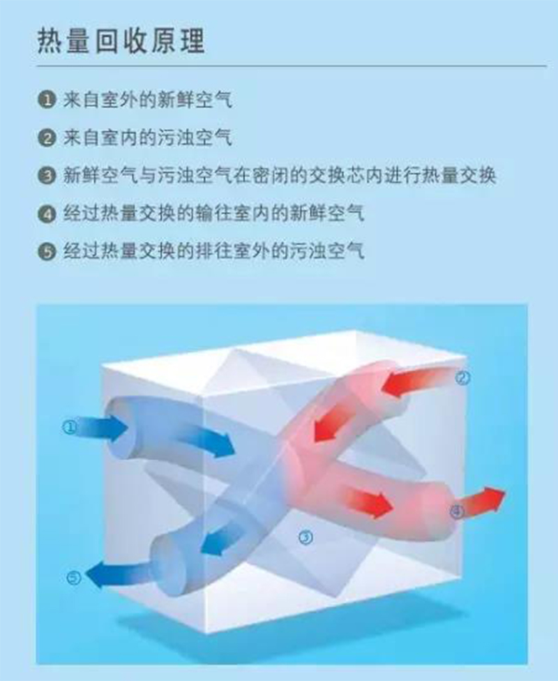 在寒冷的气候条件下,室内供暖很重要,新风系统的热量回收功能可以节约空调或取暖设备能耗。排往室外的污浊的热空气与输往室内的鲜空的冷空气,在交换芯处进行热量交换,新鲜空气被加热后,输往室内,减少了室内热能的流失。